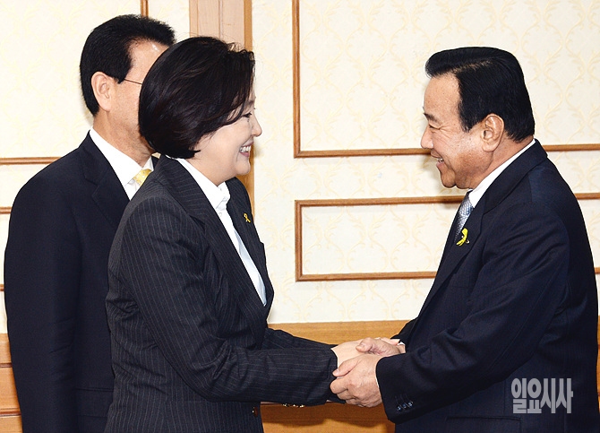 이완구 새누리당 원내대표가 박영선 새정치민주연합 원내대표와 15일 국회 귀빈식당에서 열린 여야원내 4자회동 직전, 악수를 나누고 있다.