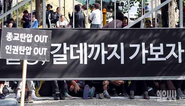 16일 유병언 전 세모그룹 회장이 검찰 소환에 불응한 가운데 이날 유 전 회장이 숨어있는 곳으로 알려진 경기도 안성시 금수원 정문 앞에 기독교복음침례회(구원파) 신도들이 모여 입구를 봉쇄하고 있다.