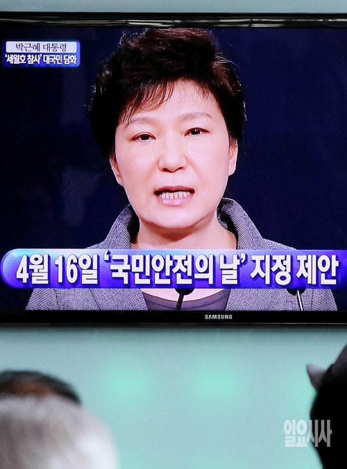 박근혜 대통령이 19일 청와대 춘추관에서 '세월호 참사'에 대한 대국민 담화를 발표하는 가운데 이날 시민들이 서울역 대합실에서 생중계를 지켜보고 있다.