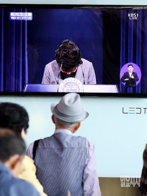 박근혜 대통령이 19일 청와대 춘추관에서 '세월호 참사'에 대한 대국민 담화를 발표하는 가운데 이날 시민들이 서울역 대합실에서 생중계를 지켜보고 있다.
