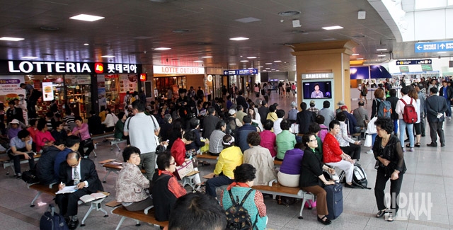 박근혜 대통령이 19일 청와대 춘추관에서 '세월호 참사'에 대한 대국민 담화를 발표하는 가운데 이날 시민들이 서울역 대합실에서 생중계를 지켜보고 있다.