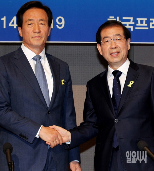19일 서울 중구 프레스센터에서 열린 서울시장 여·야 후보 관훈토론회에서 정몽준 새누리당 서울시장 후보(왼쪽)와 박원순 새정치민주연합 서울시장 후보가 인사를 나누고 있다.