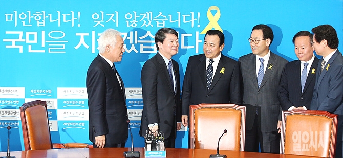 19일 오전, 새누리당 이완구 원내대표가 서울 여의도 국회에서 김한길·안철수 새정치민주연합 공동대표와 회동하고 있다.