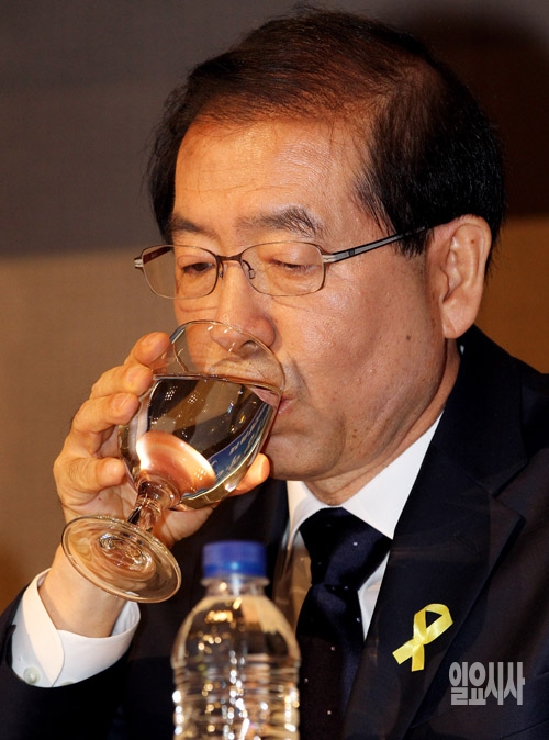박원순 새정치민주연합 서울시장 후보가 19일 서울 중구 프레스센터에서 열린 서울시장 여·야 후보 관훈토론회에서 물을 마시고 있다.