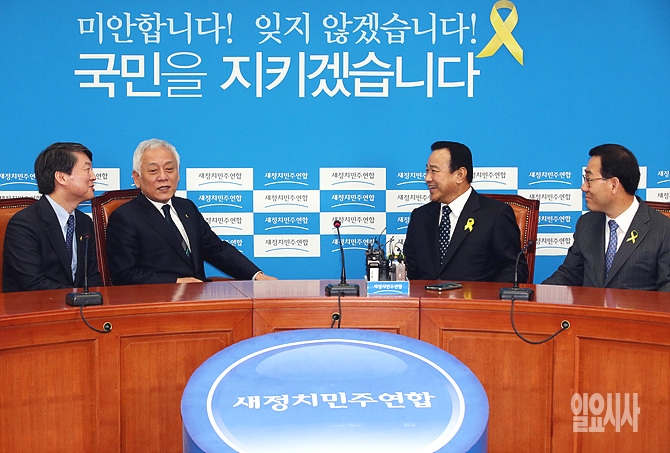 19일 오전, 새누리당 이완구 원내대표·주호영 정책위의장이 서울 여의도 국회에서 김한길·안철수 새정치민주연합 공동대표와 회동하고 있다.