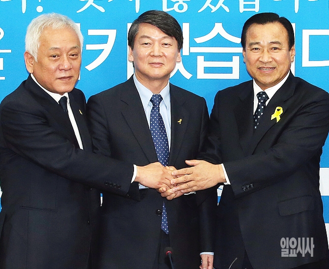 19일 오전, 새누리당 이완구 원내대표가 서울 여의도 국회에서 김한길·안철수 새정치민주연합 공동대표와 회동에서 손을 모으고 있다.