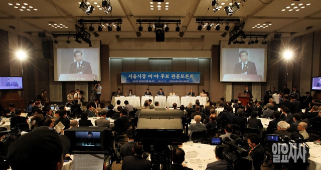 19일 서울 중구 프레스센터에서 열린 서울시장 여·야 후보 관훈토론회에서 정몽준 새누리당 서울시장 후보와 박원순 새정치민주연합 서울시장 후보가 토론을 하고 있다.