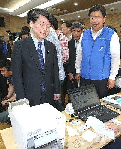 19일 오후, 안철수 새정치민주연합 공동대표가 사전투표 모의시험을 참관하기 위해 서울 영등포구 여의도동 주민센터를 방문해 사전투표 시연장에 참가해 체험하고 있다.