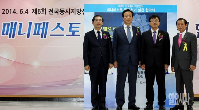19일 서울 종로구 서울시선거관리위원회에서 열린 매니페스토 정책선거 실천 협약식에 참석한 서울시장 후보들이 기념촬영을 하고 있다. 사진 왼쪽부터 박원순 새정치민주연합 후보, 정몽준 새누리당 후보, 정태흥 통합진보당 후보, 홍정식 새정치당 후보.