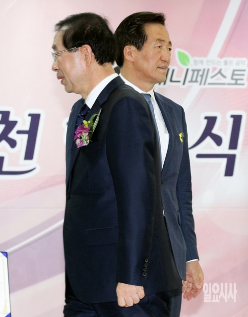 정몽준 새누리당 서울시장 후보(오른쪽)와 박원순 새정치민주연합 서울시장 후보가 19일 서울 종로구 서울시선거관리위원회에서 열린 매니페스토 정책선거 실천 협약식에 참석해 있다.