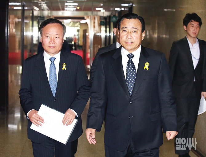 19일 오후, 새누리당 이완구 원내대표(사진 오른쪽)과 김재원 원내수석부대표가 이날 오전 박근혜 대통령의 세월호 관련 대국민담화에 대한 입장표명을 위해 원내대표실로 이동하고 있다.