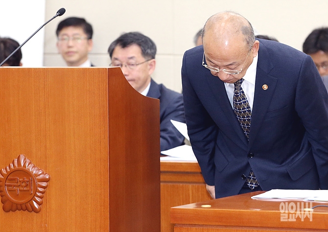 19일, 문형표 보건복지부장관이 세월호 관련 보건복지위 전체회의에 출석해 현안보고 직후 복지위원들을 향해 인사하고 있다.