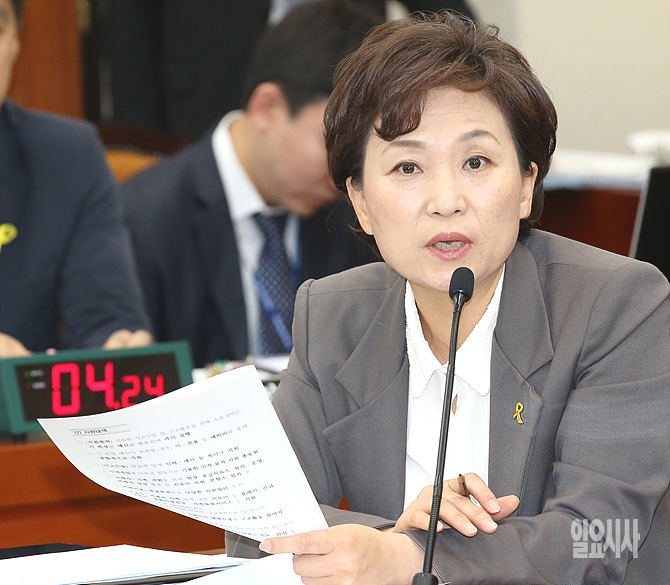 19일, 새정치민주연합 김현미 의원이 세월호 관련 기재위 전체회의에 출석해 현오석 기획재정부 장관에게 질문하고 있다.