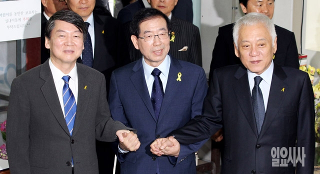 박원순 새정치민주연합 서울시장 후보(가운데)가 20일 서울 종로구 원순씨 캠프희망에서 열린 오픈하우스 캠프 출범식에 김한길(오른쪽), 안철수 공동대표와 손을 맞잡고 있다.