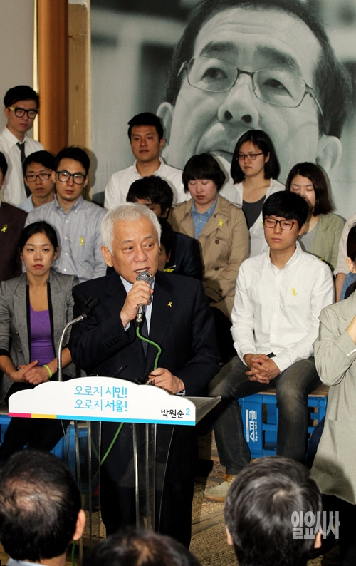김한길 새정치민주연합 공동대표가 20일 서울 종로구 원순씨 캠프희망에서 열린 박원순 서울시장 후보 오픈하우스 캠프 출범식에서 축사를 하고 있다.