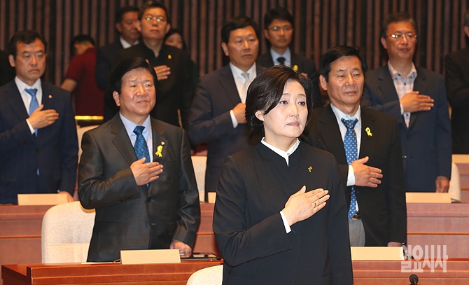 20일, 박영선 새정치민주연합 원내대표 등 의원들이 서울 여의도 국회에서 열린 의원총회 직전, 국기에 대한 경례를 하고 있다.