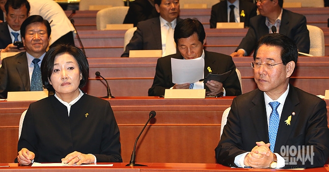 20일, 박영선 새정치민주연합 원내대표와 김영록 원내수석부대표가 서울 여의도 국회에서 열린 의원총회에 참석해 있다.