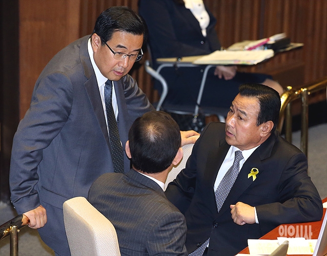 20일, 서울 여의도 국회 본회의장에서 열린 세월호 침몰사고 긴급현안질문 직전, 새누리당 이완구 원내대표, 주호영 정책위의장, 김정훈 의원이 이야기를 나누고 있다.