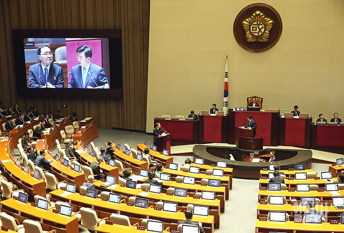 20일, 서울 여의도 국회 본회의장에서 열린 세월호 관련 긴급현안질문에서 새정치민주연합 김춘진 의원이 질의하고 있다.