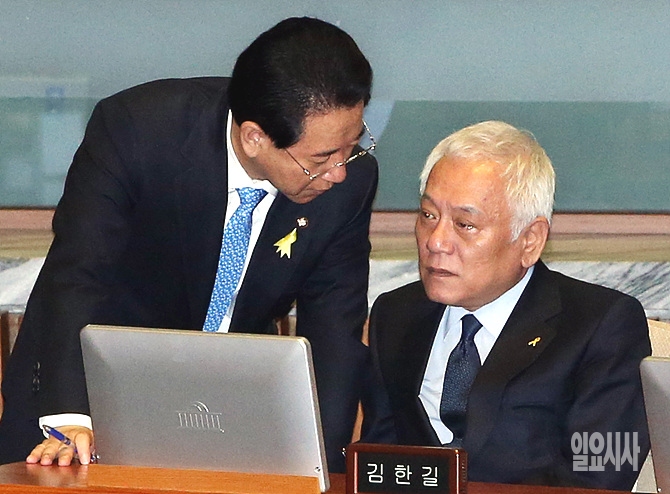 20일, 서울 여의도 국회 본회의장에서 열린 세월호 관련 긴급현안질문 직전, 새정치민주연합 김한길 공동대표와 김영록 원내수석부대표가 귀엣말을 나누고 있다.