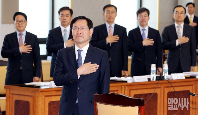 김진태 검찰총장이 21일 서울 서초동 대검찰청에서 열린 이른바 '관피아'로 불리는 민·관 유착 비리 척결을 위한 전국 검사장 회의에서 검사장들과 국기에 대한 경례를 하고 있다.