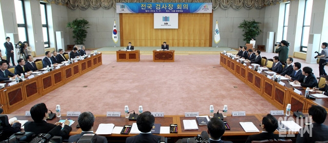 김진태 검찰총장이 21일 서울 서초동 대검찰청에서 열린 이른바 '관피아'로 불리는 민·관 유착 비리 척결을 위한 전국 검사장 회의에서 모두발언을 하고 있다.