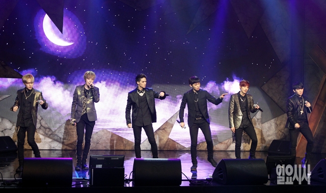 그룹 틴탑(캡, 니엘, 리키, 엘조, 창조, 천지)이 15일 서울 서교동 롯데카드 아트센터에서 열린 새 앨범 '틴탑 엑시토(TEEN TOP EXITO)' 발매기념 쇼케이스 및 기자간담회에서 열정적인 무대를 선보이고 있다.