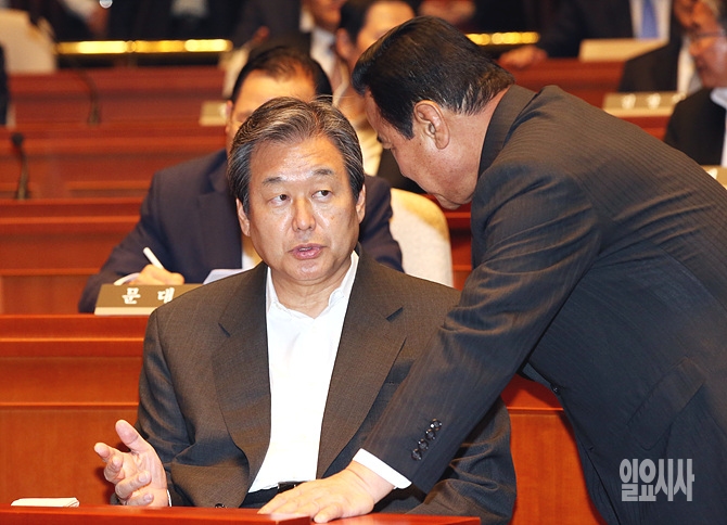 15일 오후, 서울 여의도 국회에서 새누리당 의원총회가 열린 가운데, 김무성 대표와 이완구 원내대표가 잠시 이야기를 나누고 있다.