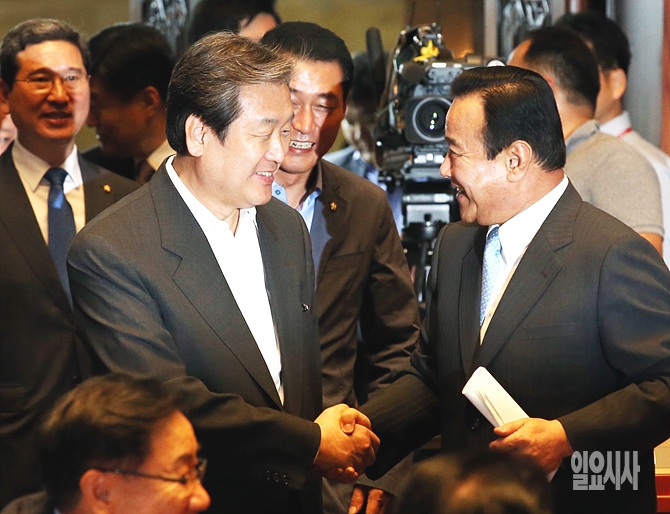 15일 오후, 서울 여의도 국회에서 열린 새누리당 의원총회 직전 김무성 대표와 이완구 원내대표가 웃으며 악수를 나누고 있다.