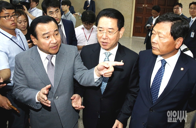 16일, 이완구 국회 운영위원장과 김영록 새정치민주연합 원내수석부대표와 강동원 원내부대표가 서울 여의도 국회 운영위원회의실 밖에서 국회 의사일정과 관련해 이야기를 나누고 있다.