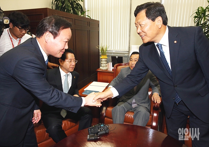16일, 이완구 국회 운영위원장·김재원 원내수석부대표와 김영록 새정치민주연합 원내수석부대표·강동원 원내부대표가 서울 여의도 국회 운영위원장실에서 국회 의사일정과 관련해 만난 가운데, 새누리당 김 원내수석부대표(사진 왼쪽)와 새정치연합 강 원내부대표(사진 오른쪽)가 악수를 나누고 있다.