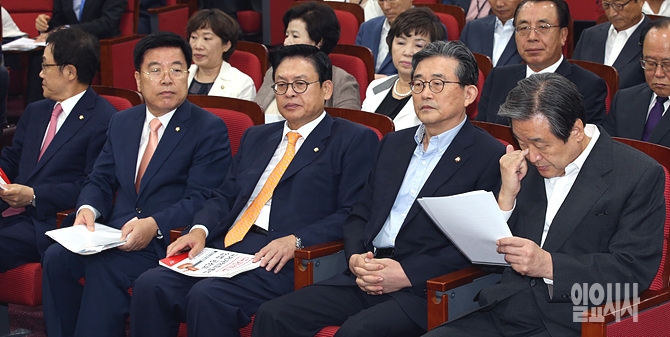 16일, 서울 여의도 국회에서 새누리당 경제혁신특위 주재로 국민행복 일자리 창출 및 국가경쟁력 재고를 위한 '규제개혁특별법 공청회'에 새누리당 김무성 대표, 이한구 경제혁신특별위원장, 정우택 최고위원(사진 오른쪽부터) 등이 공청회에 참석해 있다.