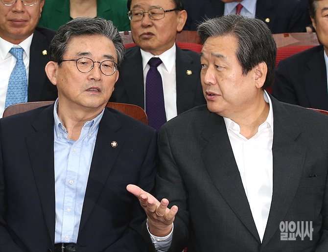 16일, 서울 여의도 국회에서 새누리당 경제혁신특위 주재로 국민행복 일자리 창출 및 국가경쟁력 재고를 위한 '규제개혁특별법 공청회'에서 새누리당 김무성 대표(사진 오른쪽)가 이한구 경제혁신특별위원장과 이야기를 나누고 있다.