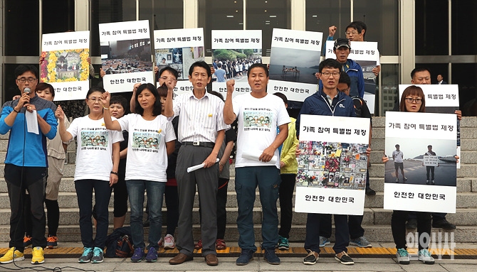 16일, 서울 여의도 국회 앞 계단에서 김병권 세월호유가족 위원장(사진 오른쪽에서 세 번째) 등이 세월호 특별법 제정을 요구하며 새누리당 김무성 대표와 박근혜 대통령과의 면담 관련 기자회견을 갖고 있다.