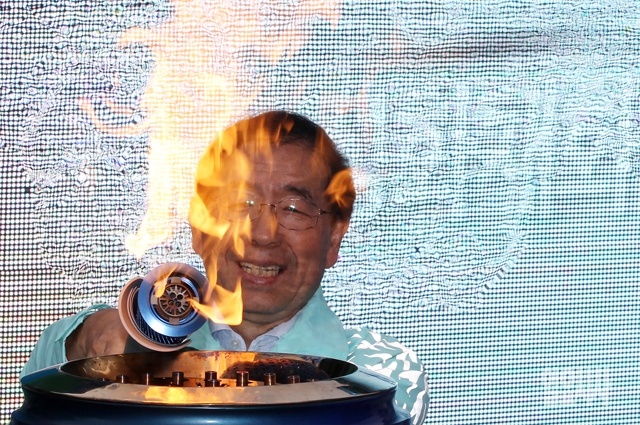 16일 서울시청 앞 광장에서 열린 2014 인천아시아경기대회 성화봉송 행사에서 박원순 서울시장이 성화를 안치하고 있다.