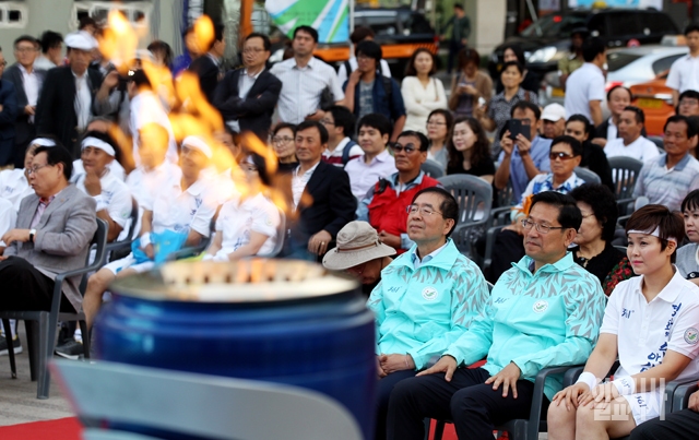 16일 서울시청 앞 광장에서 열린 2014 인천아시아경기대회 성화봉송 행사에서 박원순 서울시장을 비롯한 참석자들이 행사를 지켜보고 있다.
