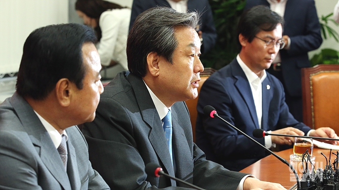 16일, 새누리당 김무성 대표(사진 가운데)가 이완구 원내대표(사진 왼쪽), 김영우 대변인 등이 함께 배석한 가운데, 서울 여의도 국회에서 박근혜 대통령과의 만남 직후 기자간담회을 갖고 있다.
