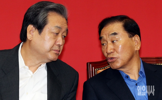 17일 서울 여의도 국회에서 열린 새누리당 최고중진연석회의에서 김무성 대표(왼쪽)와 이재오 의원과 대화하고 있다.