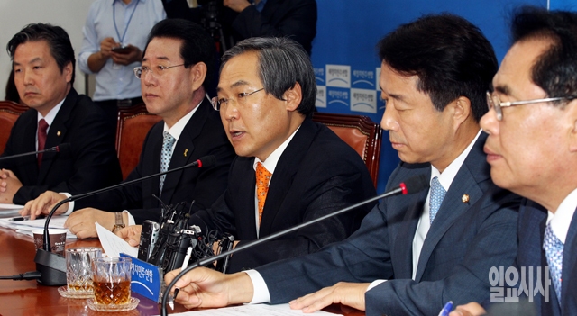 우윤근 새정치민주연합 정책위의장(오른쪽에서 세번째)이 17일 서울 여의도 국회에서 열린 정책조정회의에서 모두발언을 하고 있다.