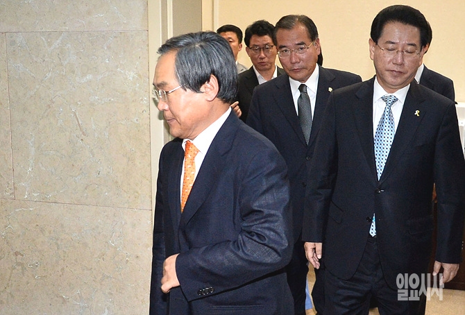 17일 오전 서울 여의도 국회 의장실을 국회의사일정과 관련해 항의 방문한 우윤근 정책위의장(사진 왼쪽), 김영록 원내수석부대표(사진 오른쪽) 등 새정치민주연합 원내대표단이 면담을 마친 뒤 퇴장하고 있다. (현장풀)