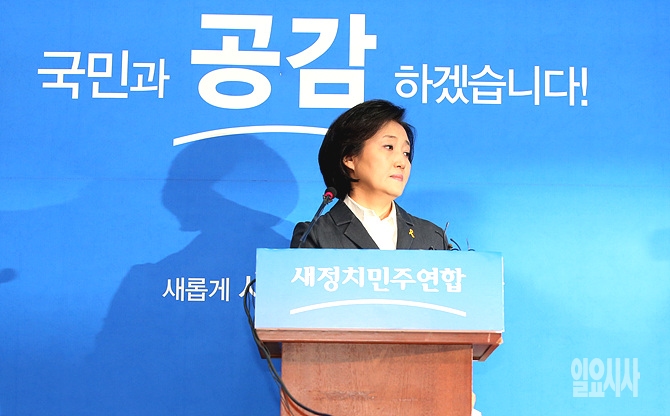 17일, 서울 여의도 국회에서 '탈당 논란'에 휩싸였던 박영선 새정치민주연합 국민공감혁신위원장 겸 원내대표가 나흘 만의 칩거 끝에 복귀 기자회견 도중 질문을 받고 있다.