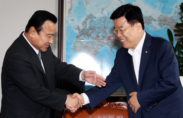 18일 서울 여의도 국회 정보위원장실에서 열린 정보위 간담회에서 김광림 위원장(오른쪽)과 이완구 새누리당 원내대표가 인사하고 있다.