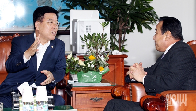 18일 서울 여의도 국회 정보위원장실에서 열린 정보위 간담회에서 김광림 위원장(왼쪽)과 이완구 새누리당 원내대표가 대화하고 있다.