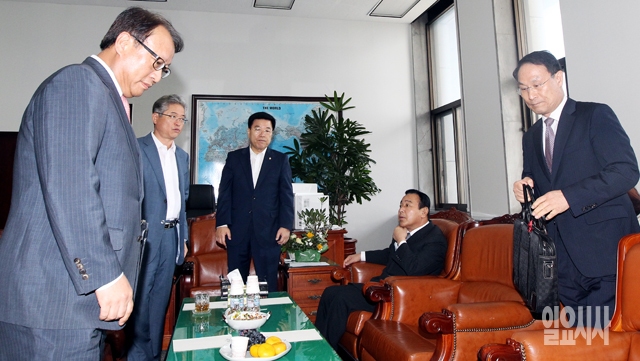 18일 서울 여의도 국회 정보위원장실에서 열린 정보위 간담회에서 김광림 위원장(가운데)을 비롯한 여당 의원들이 국정원 간부를 맞이하고 있다.