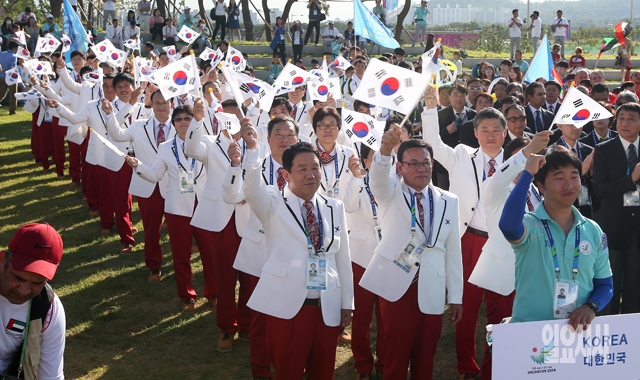 한국선수단이 18일 인천 구월아시아드선수촌 국기광장에서 2014 인천아시아경기대회 선수촌 입촌식을 갖고 있다.