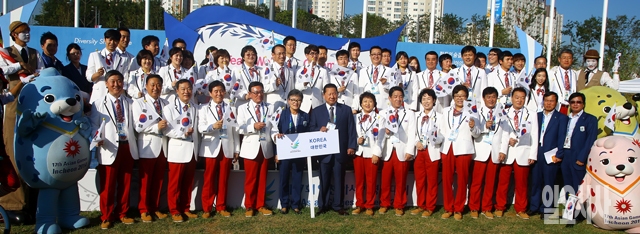 18일 인천 구월아시아드선수촌 국기광장에서 열린 2014 인천아시아경기대회 선수촌 입촌식에서 한국선수단이 기념촬영을 하고 있다.