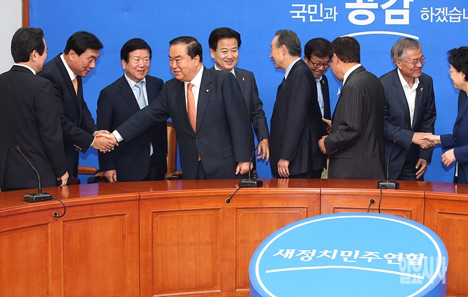 18일 오후, 서울 여의도 국회에서 새정치민주연합이 문희상 상임고문을 신임 비상대책위원장으로 합의 추대한 가운데, 정동영 상임고문, 박기춘 전 원내대표, 문재인 의원, 한명숙 의원 등이 악수를 나누고 있다.