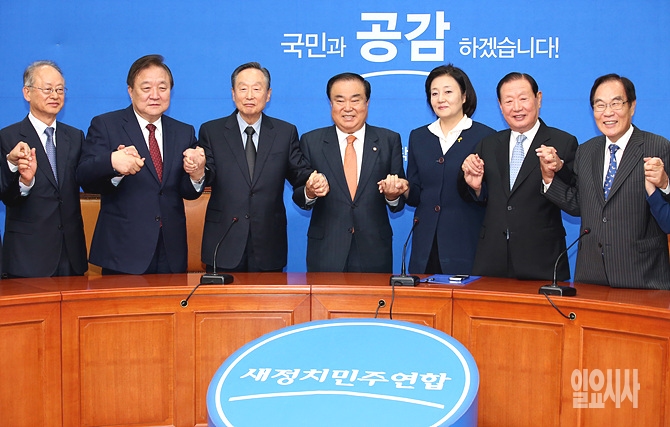 18일 오후, 서울 여의도 국회에서 새정치민주연합이 문희상 상임고문을 신임 비상대책위원장으로 합의 추대한 가운데, 문 신임 비대위원장이 김원기(사진 오른쪽에서 두 번째)·정대철(사진 왼쪽에서 두 번째) 등 상임고문, 박영선 원내대표(사진 오른쪽에서 세 번째) 등과 손을 맞잡고 있다.