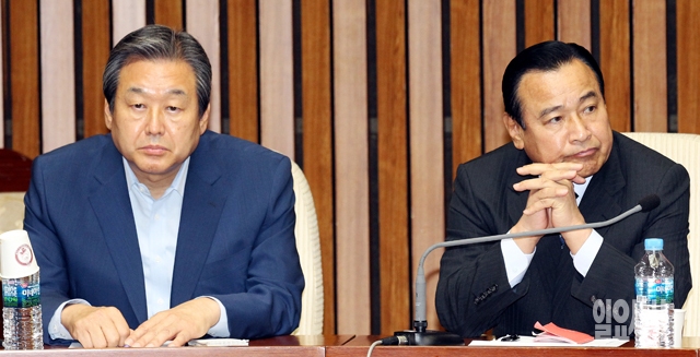 19일 서울 여의도 국회에서 열린 새누리당 주요당직자회의에서 김무성 대표(왼쪽)와 이완구 원내대표가 생각에 잠겨 있다.