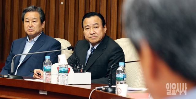 19일 서울 여의도 국회에서 열린 새누리당 주요당직자회의에서 김무성 대표(왼쪽)와 이완구 원내대표가 동료의원의 발언을 경청하고 있다.